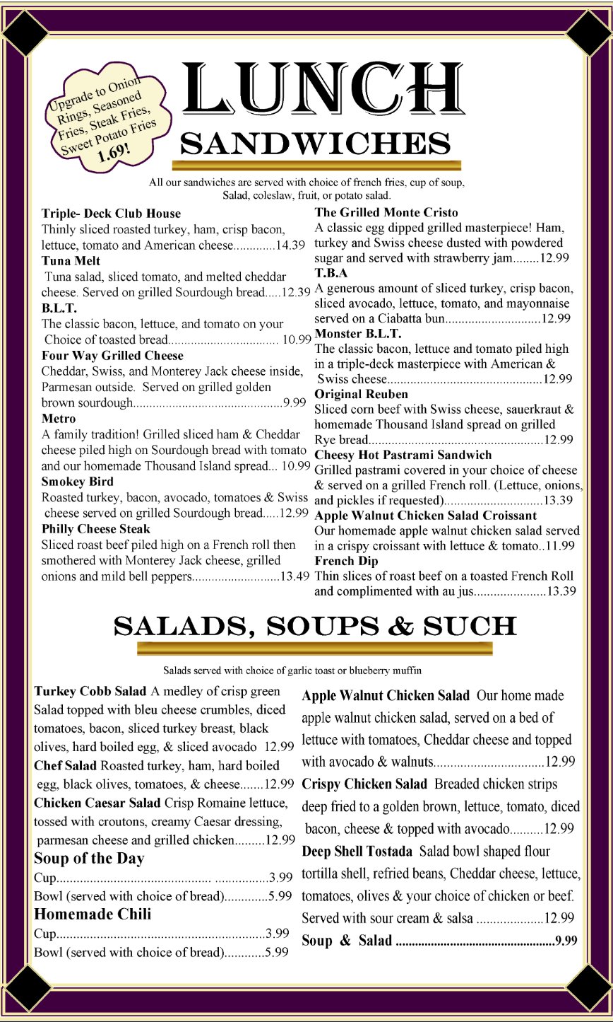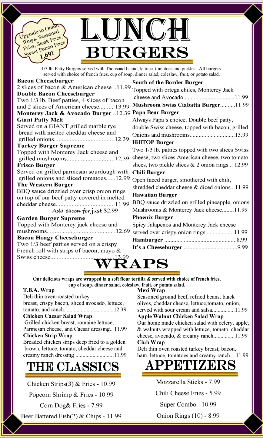 Our lunch menu offers a wide variety of delicious meals to choose from. Bring your family and friends and join us for a relaxing afternoon at the Hilltop Cafe.