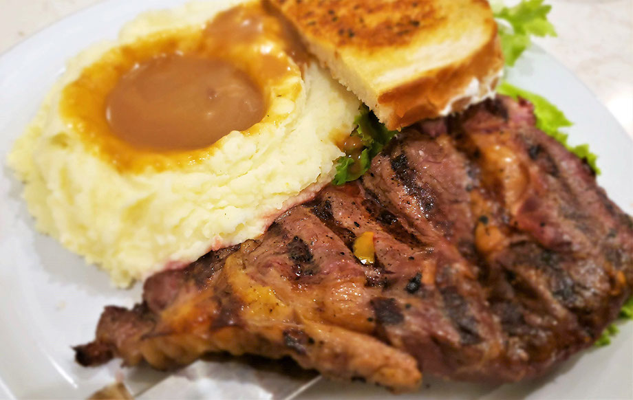 Dinner entrées served with choice of side (baked potato, mashed potatoes, French fries, fresh steamed vegetables, sautéed zucchini)