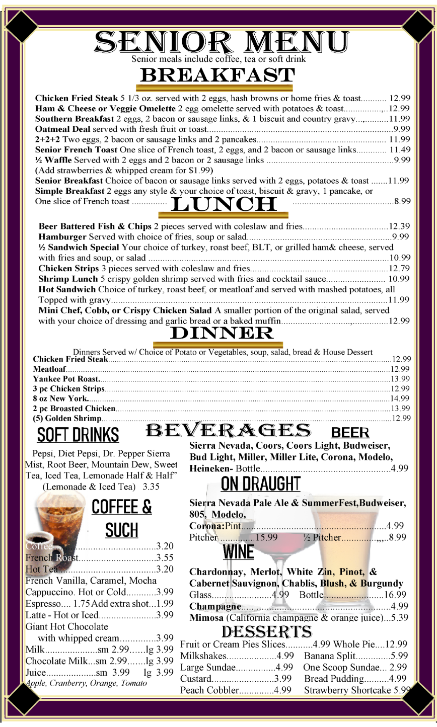 You can find our beverages, beer, wine and desserts on the bottom of the Senior Menu.